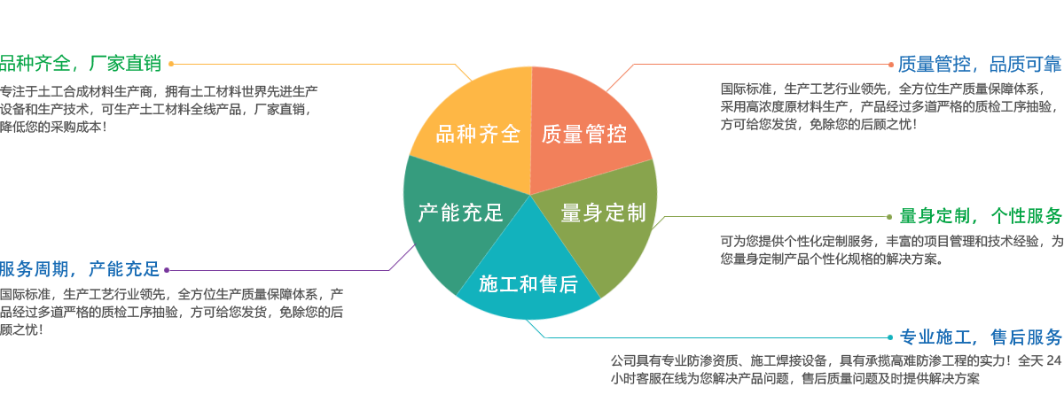 公司所有產品均采用國際標準組織生產,并經國家、市技術監(jiān)督局采標驗收,生產工藝及水平全國領先,屬國內優(yōu)等水平,實物質量達到國際先進水平。經用戶、施工單位使用證明,質量穩(wěn)定可靠、施工方便、價格合理、售后服務完善。產品主要應用于農業(yè)、海綿城市建設、公路、鐵路、垃圾填埋場防滲,水利、電力、水土保持及環(huán)境綠化與基礎建設領域,已被廣泛應用于高速公路、鐵路、垃圾填埋場等多項國家重點工程,受到工程界專家及廣大用戶的一致好評。